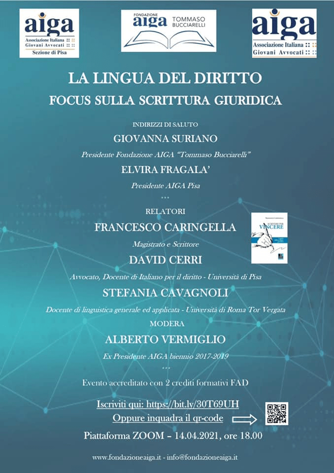 Iniziative di carattere linguistico La lingua del diritto. Incontro sul linguaggio giuridico e su una buona scrittura (Associazione italiana giovani avvocati, 14 aprile 2021 ore 18) Date: 30 marzo 2021Author: Francesca Dragotto 0 Commenti Condividi: Fai clic per condividere su X (Si apre in una nuova finestra) X Fai clic per condividere su Facebook (Si apre in una nuova finestra) Facebook Mi piace Caricamento... Correlati