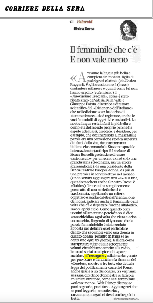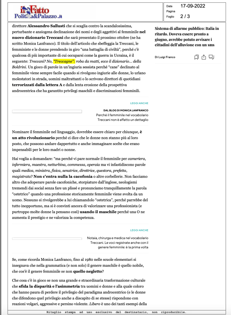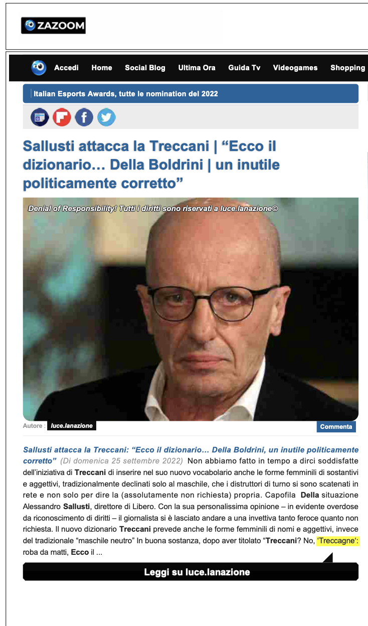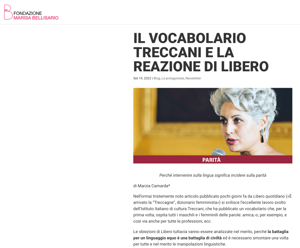 Iniziative di carattere linguistico Género y lenguaje: debates sobre exclusiones, inclusiones y transformaciones – Materiali Date: 21 ottobre 2022Author: Francesca Dragotto 0 Commenti https://www.ilfattoquotidiano.it/2022/09/17/treccani-e-desinenze-al-femminile-sallusti-si-allarma-per-una-a-e-le-matte-saremmo-noi/6807080/ https://luce.lanazione.it/attualita/sallusti-attacca-la-treccani-ecco-il-dizionario-della-boldrini-un-inutile-politicamente-corretto/ https://www.fondazionebellisario.org/il-vocabolario-treccani-e-la-reazione-di-libero/ https://grammaticaesessismo.com/2018/10/08/pregiudizi-linguistici-quando-la-fake-news-sa-di-stantio-e-di-infondato-il-caso-del-genere-grammaticale-femminile-nei-nomi-di-professione-e-altri-stereotipi/ Condividi: Fai clic per condividere su X (Si apre in una nuova finestra) X Fai clic per condividere su Facebook (Si apre in una nuova finestra) Facebook Mi piace Caricamento... Correlati
