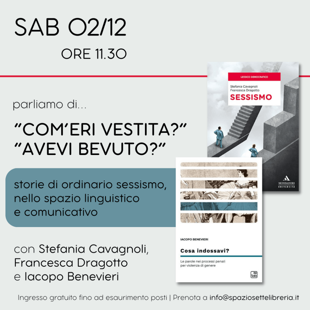 Iniziative di carattere linguistico “Com’eri vestita? Avevi bevuto?”. Storie di ordinario sessismo, nello spazio linguistico e comunicativo (Spazio Sette, Roma, 2 dicembre 2023) Date: 24 novembre 2023Author: Francesca Dragotto 0 Commenti Condividi: Fai clic per condividere su X (Si apre in una nuova finestra) X Fai clic per condividere su Facebook (Si apre in una nuova finestra) Facebook Mi piace Caricamento... Correlati