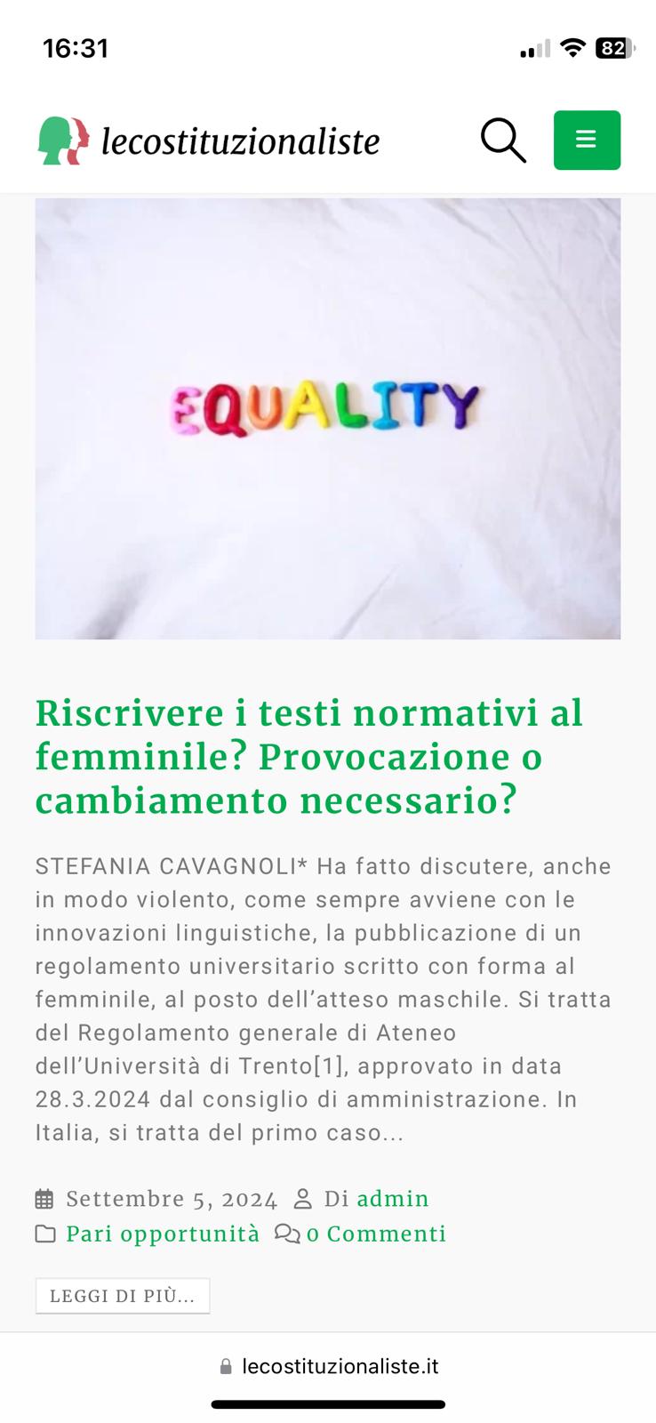 Iniziative di carattere linguistico Riscrivere i testi normativi al femminile? Provocazione o cambiamento necessario? (Le costituzionaliste, 5 settembre 2024) Date: 5 settembre 2024Author: Francesca Dragotto 0 Commenti Condividi: Fai clic per condividere su X (Si apre in una nuova finestra) X Fai clic per condividere su Facebook (Si apre in una nuova finestra) Facebook Mi piace Caricamento... Correlati