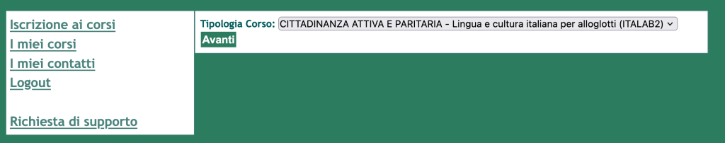 Nella pagina che apparirà cliccare su “ISCRIZIONE AI CORSI”. Quindi selezionare il corso “Cittadinanza attiva e paritaria – Lingua e cultura italiana per alloglotti (ITALAB2)”. Poi premere “Avanti”, quindi “Ho letto e compreso l’informativa”. Nelle schermate successive occorrerà completare l’inserimento dei propri dati.